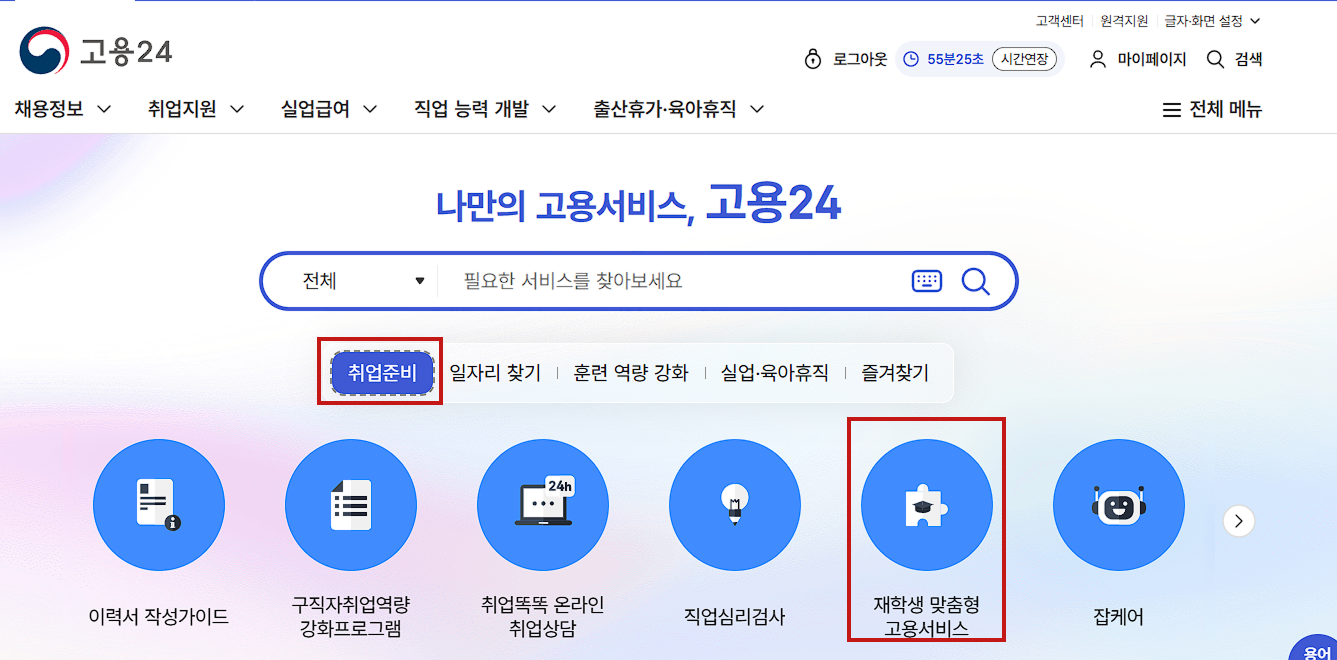 - 메인화면의 '취업준비 - 재학생 맞춤형 고용서비스'를 클릭합니다