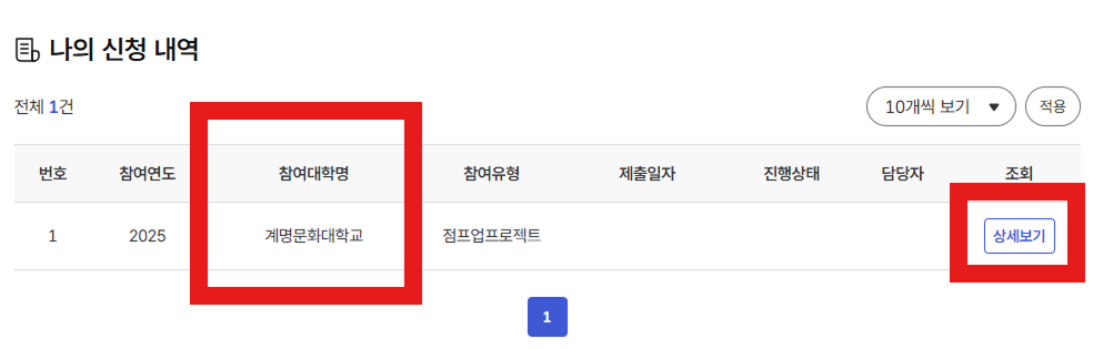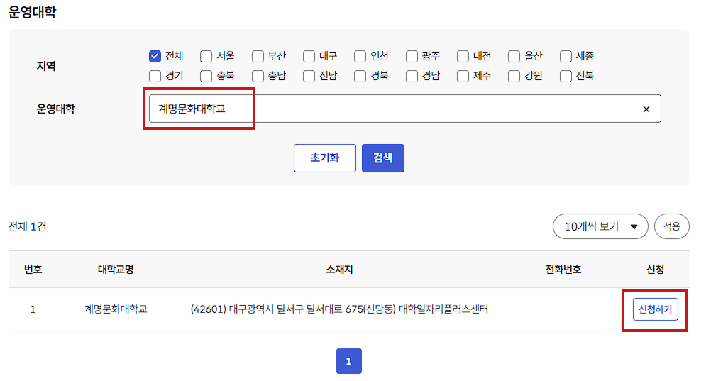 - 운영대학 란에 '계명문화대학교'를 검색 후, 신청하기를 클릭합니다