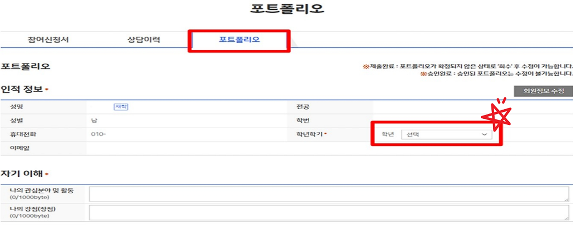 - 포트폴리오 탭에서 '학년학기' 항목을 필수로 선택해주세요