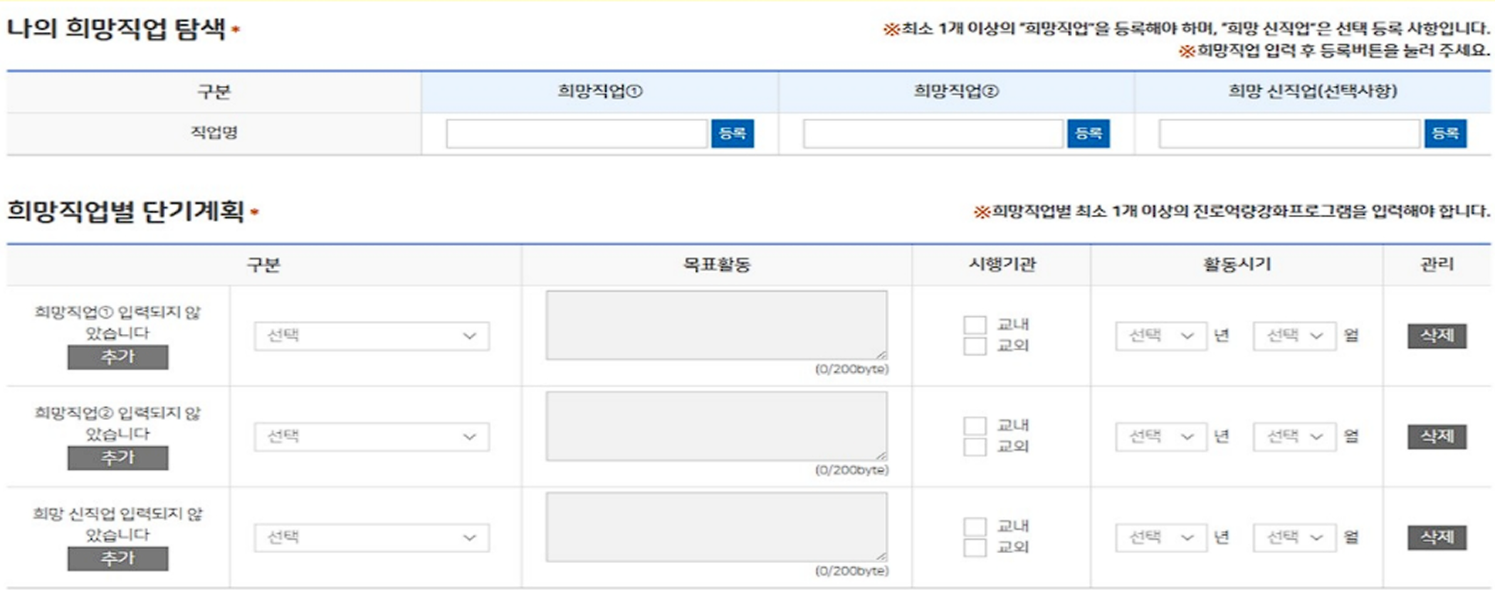 - 나의 희망직업 탐색, 희망직업별 단기계획 항목을 작성해주세요