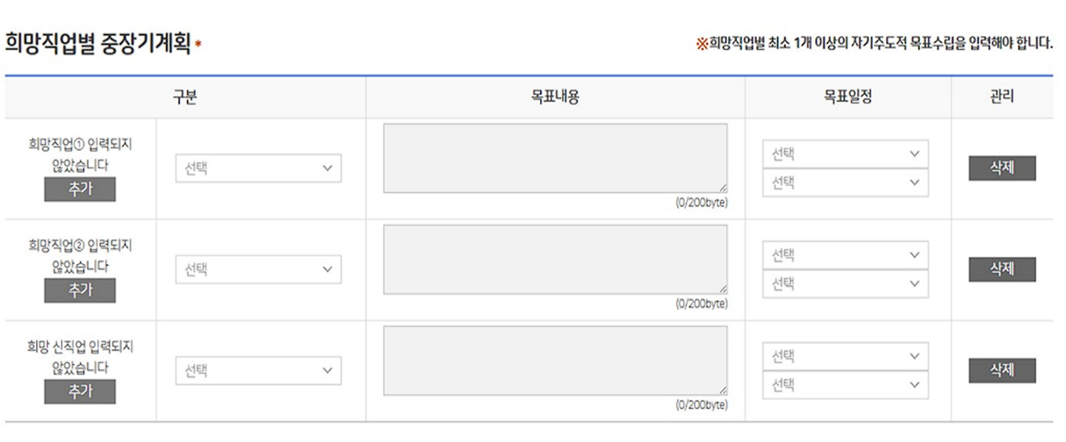 - 1. 희망 직업별 중장기 계획 중 '구분' 항목을 선택한 뒤, 목표내용 작성 및 목표 일정을 선택해주세요