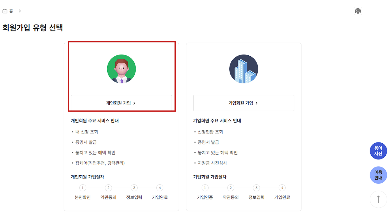 - 회원가입 유형 중, '개인회원 가입'을 선택합니다.