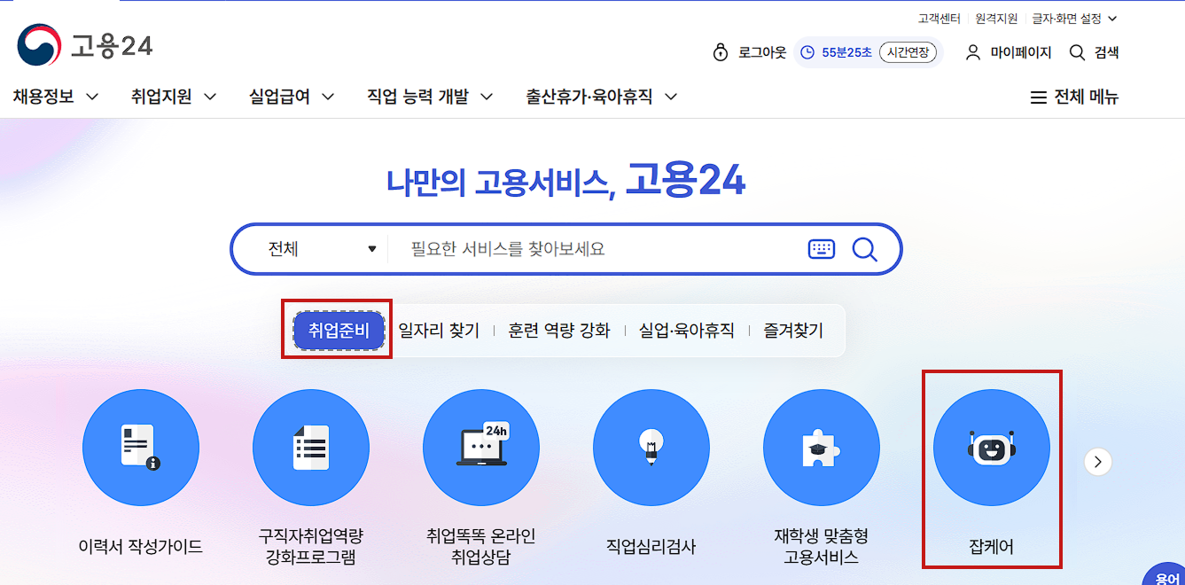 - 간편인증 로그인 후, 메인화면의 '취업준비 - 잡케어'를 클릭합니다