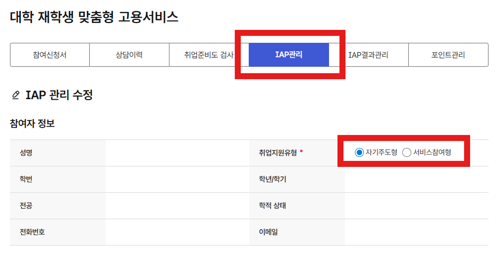 - 'IAP계획관리'클릭 후 취업지원유형을 선택합니다